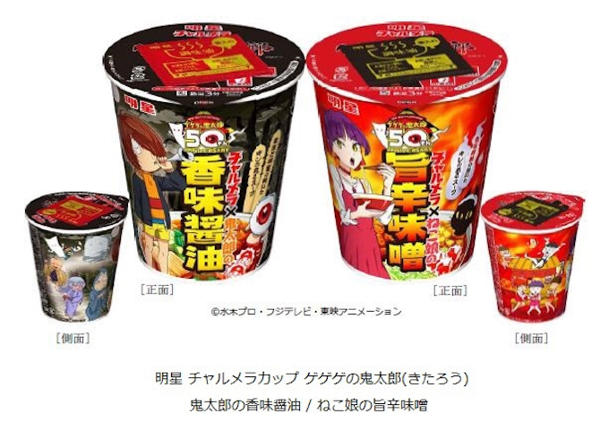 明星 チャルメラカップ ゲゲゲの鬼太郎 鬼太郎の香味醤油 ねこ娘の旨辛味噌 10月22日発売 日清食品グループ